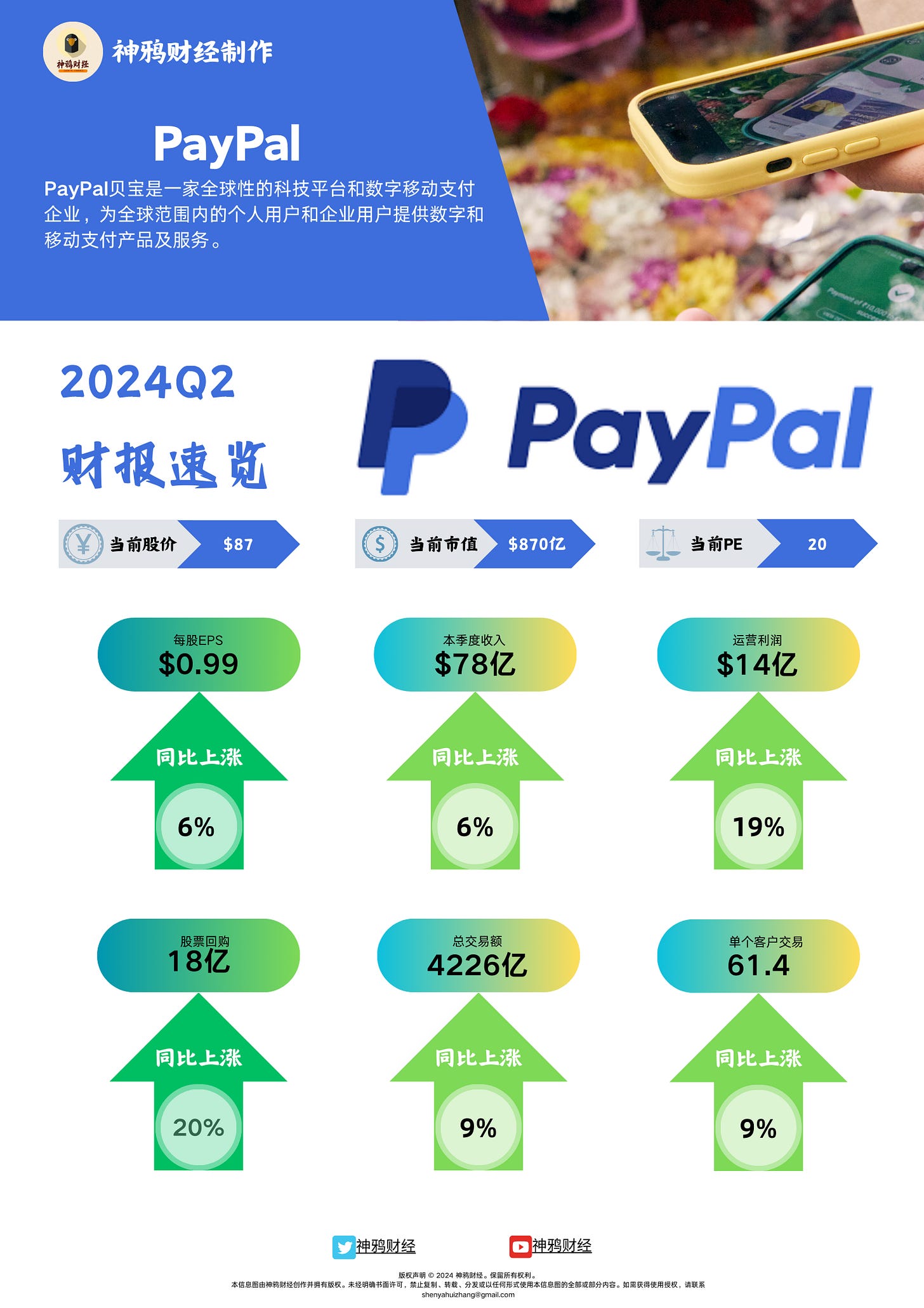💰 每股净利润0.99美金,总交易金额4226亿美金! PayPal本季度财报表现稳健:收入78亿美金,同比增长6%;净利润增长6%;单客户年交易次数达到61.4次,同比增长9%。稳中求进,这家支付巨头继续巩固自己的行业地位。